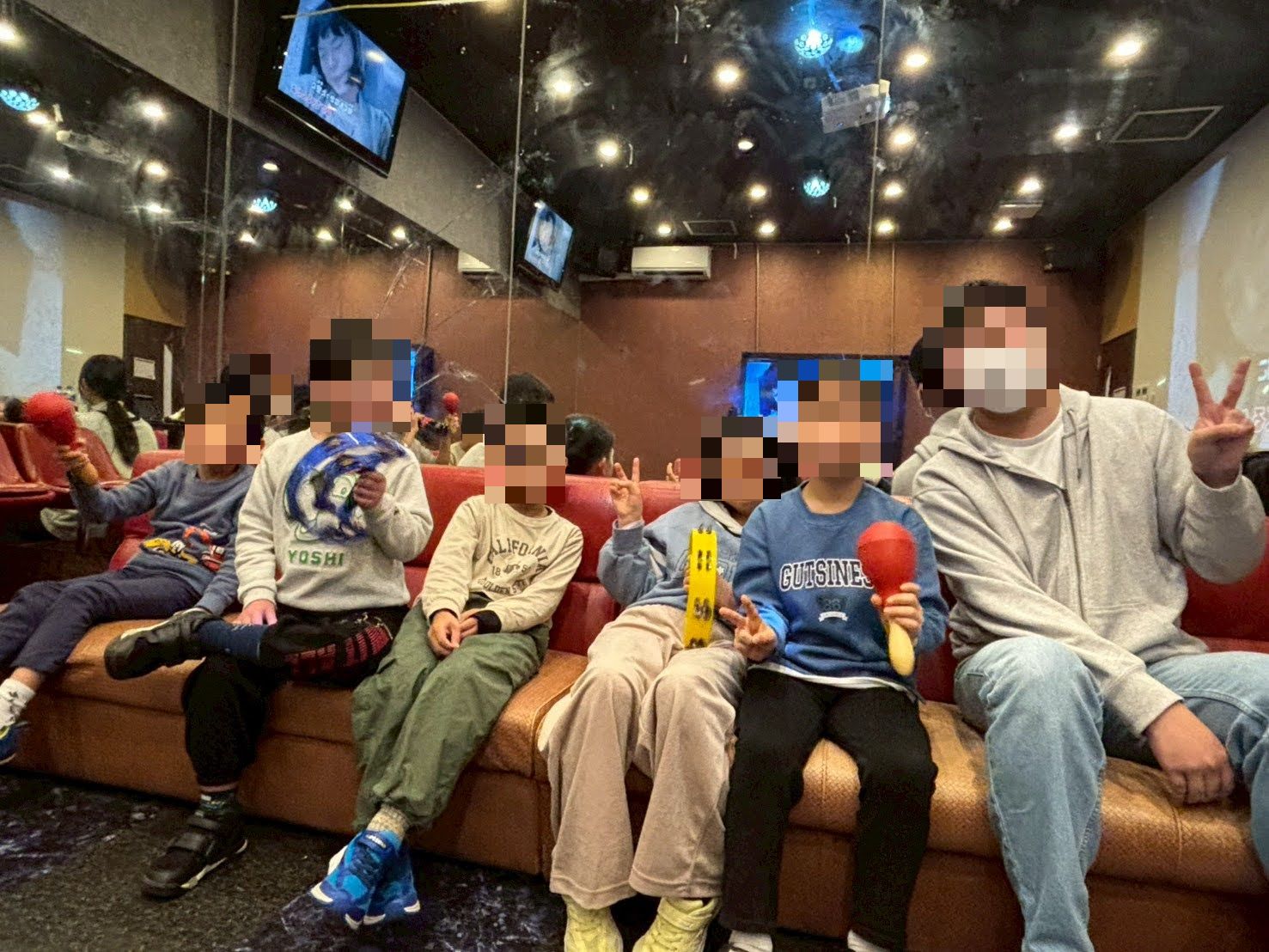 大きなフロアを借りて自分の歌いたい曲を自分で予約し楽しく歌います。時には友だちと一緒に歌ったり、マラカスやタンバリンで盛り上げたりととても楽しく活動しています。