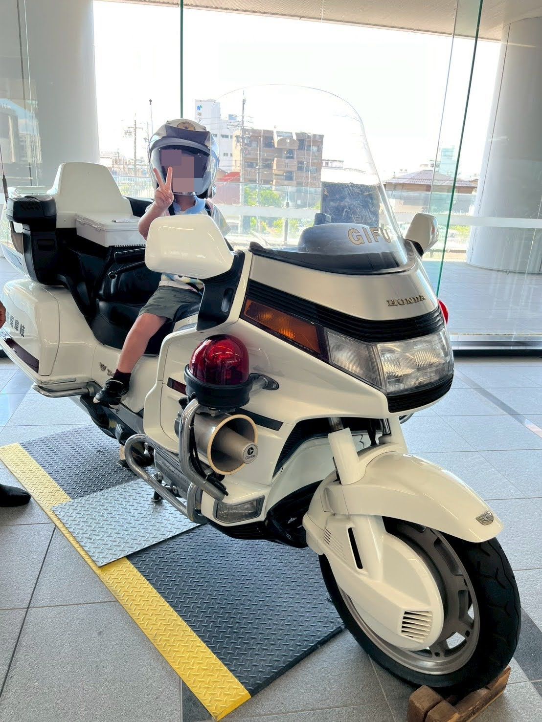 事件や事故が起きた場合に電話を受ける通信指令課や周辺の交通情報を管理する交通管制センターの見学をしたり、白バイなどの警察車両に乗って記念撮影もしました。