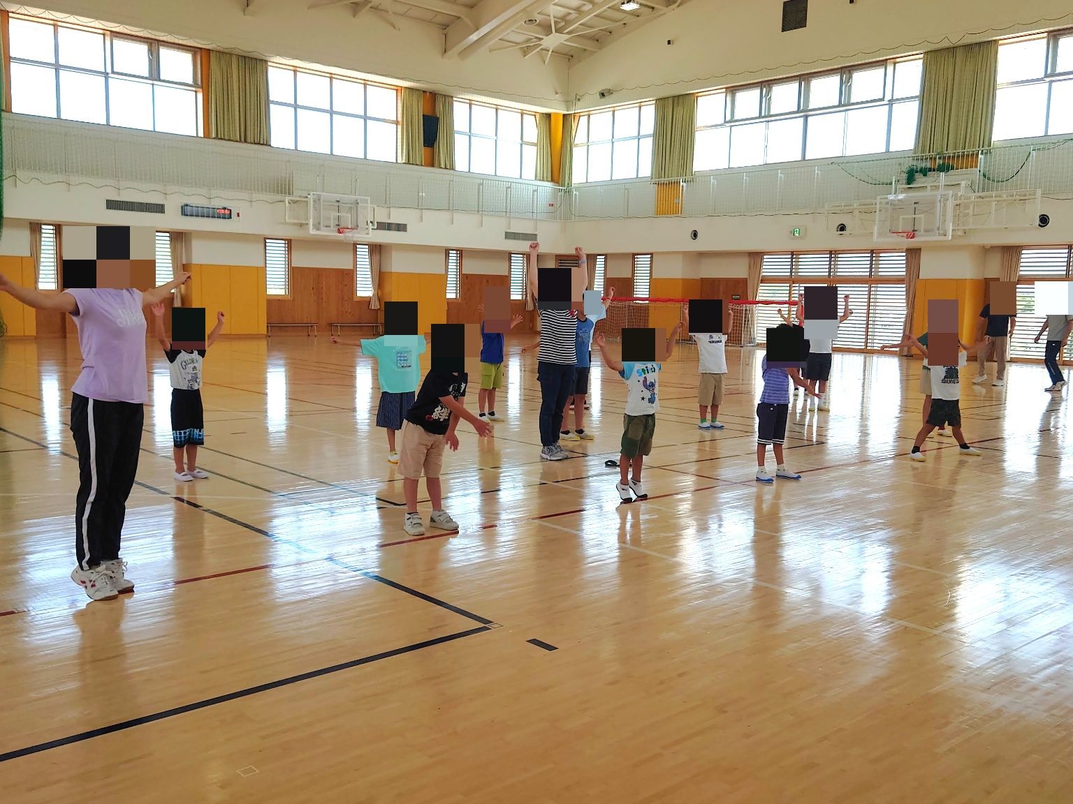 2階部分のフロアを全面貸し切り、みんなで鬼ごっこをしたりいくつかのグループに分かれて運動療育を行います。活動の前には全員でラジオ体操も行い、安全に活動に取り組めるようにしています。
